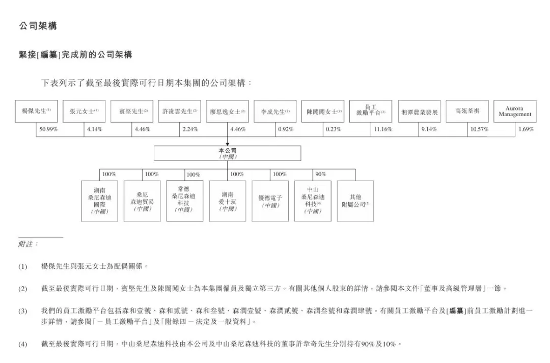 根据招股书披露,桑尼森迪最初成立时,是由杨杰(现为桑尼森迪执行董事)和独立第三方言覃共同设立,初始注册资本1500万元,两人分别持股65%、35%。2017年,言覃将所持全部股权转让给独立第三方言政,后者又于2018年将34%、1%股权分别转让给杨杰、许凌云。自此,该公司的持股人变为杨杰(99%)、许凌云(1%)。