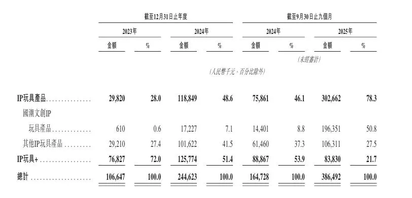 ▌首先是IP玩具产品。桑尼森迪与知名IP合作开发及制造IP玩具产品,并通过多元渠道向终端消费者提供该等产品。这些产品一般每件建议零售价为9.9元或以下。2023年、2024年、2025年前9个月,该公司通过IP玩具产品实现收入分别为2982万元、1.19亿元、3.03亿元,毛利率分别为10.3%、23.2%、36.8%,销量分别为636.1万件、2765.1万件、5814.8万件。对于2025年业绩大涨的原因,桑尼森迪将其归功于国潮文创IP玩具产品,在各大销售渠道的收入贡献有所增加。